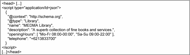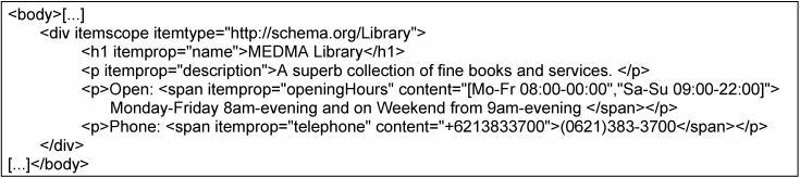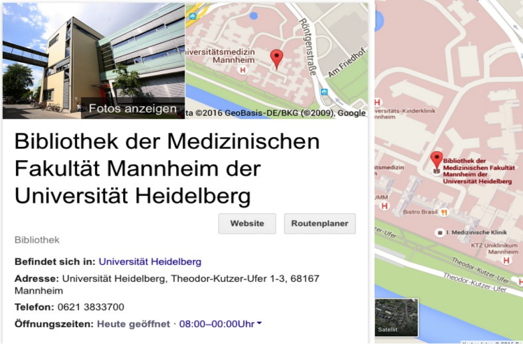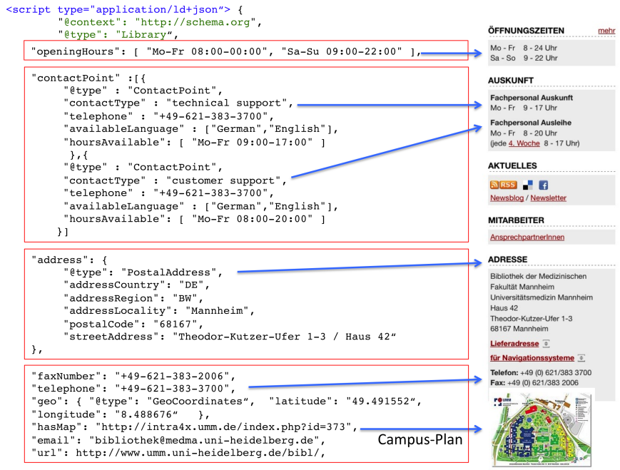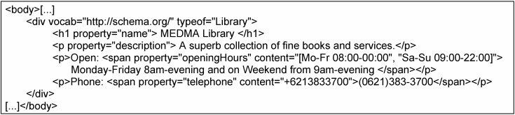 Das Semantic Web ist schon seit über 10 Jahren viel beachtet und hat mit der Verfügbarkeit von Resource Description Framework (RDF) und den entsprechenden Ontologien einen großen Sprung in die Praxis gemacht. Vertreter kleiner Bibliotheken und Bibliothekare mit geringer Technik-Affinität stehen aber im Alltag vor großen Hürden, z.B. bei der Frage, wie man diese Technik konkret in den eigenen Webauftritt einbinden kann: man kommt sich vor wie Don Quijote, der versucht die Windmühlen zu bezwingen. RDF mit seinen Ontologien ist fast unverständlich komplex für Nicht-Informatiker und somit für den praktischen Einsatz auf Bibliotheksseiten in der Breite nicht direkt zu gebrauchen. Mit Schema.org wurde ursprünglich von den drei größten Suchmaschinen der Welt Google, Bing und Yahoo eine einfach und effektive semantische Beschreibung von Entitäten entwickelt. Aktuell wird Schema.org durch Google, Microsoft, Yahoo und Yandex weiter gesponsert und von vielen weiteren Suchmaschinen verstanden. Vor diesem Hintergrund hat die Bibliothek der Medizinischen Fakultät Mannheim auf ihrer Homepage (http://www.umm.uni-heidelberg.de/bibl/) verschiedene maschinenlesbare semantische Metadaten eingebettet. Sehr interessant und zukunftsweisend ist die neueste Entwicklung von Schema.org, bei der man eine ‚Library‘ (https://schema.org/Library) mit Öffnungszeiten und vielem mehr modellieren kann. Ferner haben wir noch semantische Metadaten im Open Graph- und Dublin Core-Format eingebettet, um alte Standards und Facebook-konforme Informationen maschinenlesbar zur Verfügung zu stellen.