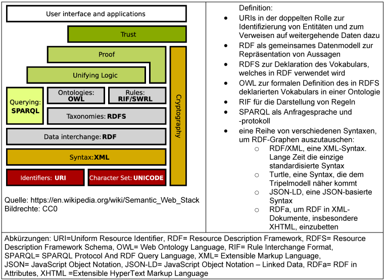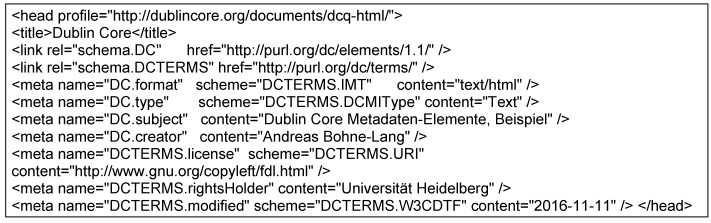 haben, in dem Metadaten über die Webseite untergebracht werden sollen, und einen Inhaltsbereich . Der damalige Entwurf definierte im Kopfbereich nur die Tags , <isindex>, <nextid> und <link>. In der zweiten Version von HTML, die im November 1995 unter Request for Comments ‚rfc1866‘ <a href="#intRef:5">[5]</a> erschien, war der Metadatenbereich erweitert worden. Diese Version von HTML fügte dem HEAD-Bereich ein weiteres Elemente hinzu und sah hier nun unter Punkt 5.2.5 den Bereich ‚Associated Meta-information‘ vor. Dieses neu eingeführte Meta-Element sah vor, dass über dessen Verwendung sowohl der Zugriff auf das Dokument geregelt werden sollte als auch, dass es Information über den Inhalt, die Eigenschaft und Dienlichkeit des Inhalts bereit hielt. Diese zweite Version von HTML stellte jedoch für das META-Tag nur ein Attribut das HTTP-EQUIV zur Verfügung. Dieses Attribut war so definiert, dass es universell eingesetzt werden konnte. So war es hiermit möglich, die Gültigkeit des Webseiten-Inhaltes zu definieren – Beispiel <meta http-equiv="Expires" content="Tue, 04 Dec 1993 21:29:02 GMT">. Aber auch einfach Schlagwörter wie <meta http-equiv="Keywords" content="Beany"> konnten so dem Server und damit auch dem Web-Browser übermittelt werden. <h3>Dublin Core</h3><p>Die 1995 in der Planung <a href="#intRef:6">[6]</a> vorliegende Version 3.0 von HTML wurde 1996 als W3C-Empfehlung herausgegeben und im gleichen Jahr wurden auch Überlegungen zu der Einbettung von Metadaten in HTML angestellt <a href="#intRef:7">[7]</a> (siehe Tabelle 1 <a href="#table:1">[Tab. 1]</a>). Im Jahr 1997 wurde die HTML-Version 3 durch die Version 4.0 ersetzt, welche 1999 die Einbindung von Dublin-Core-Elementen in die technischen Spezifikationen der Requests For Comments (RFC) mit ‚Encoding Dublin Core Metadata in HTML‘ festlegte <a href="#intRef:7">[7]</a>, <a href="#intRef:8">[8]</a>. Ab 2010 war die Einbindung von Metadaten keine RFC-Empfehlung mehr, sondern wanderte in die Obhut der Dublin Core Metadata Initiative DCMI (<a href="http://dublincore.org/" target="_blank">http://dublincore.org/</a>). In Tabelle 2 <a href="#table:2">[Tab. 2]</a> wird gezeigt, wie aktuelle Dublin-Core-Metadaten in Webseiten mittels HTML in der Version 5 zu integrieren sind. <p><a id="table:1"></a><figure type="table"><figcaption><p><strong>Tabelle 1: Diese 15 Elemente wurden 1998 offiziell als Dublin Core Metadata Element Set, Version 1.0 [30] veröffentlicht</strong></p></figcaption><img src="/sites/default/files/publisso/journals/86/mbi000372/mbi000372.t1.png" class="img-responsive"></figure></p><p><a id="table:2"></a><figure type="table"><figcaption><p><strong>Tabelle 2: Implementierung von Metadaten in HTML 5. Die genaue Formatierung der Dublin Core Metadata hat sich im Laufe der veröffentlichten HTML-Versionen verändert.</strong></p></figcaption><img src="/sites/default/files/publisso/journals/86/mbi000372/mbi000372.t2.png" class="img-responsive"></figure></p></p><h3>Suchanfragen</h3><p>Betrachtet man, wie die heutigen Benutzer im Web suchen, so wird man feststellen, dass die Suchanfragen meist aus einem oder mehreren Stichwörtern bestehen, welche die Benutzer in den Suchschlitz der Suchmaschinen eingeben. Dabei wird in der Regel intuitiv von einer ‚und‘-Verknüpfung ausgegangen, obschon z.B. die Suchmaschine von Google weitaus mehr Suchoperatoren unterstützt <a href="#intRef:9">[9]</a>. Durch die Schnittmengenbildung via ‚und‘ versuchen Benutzer, die Trefferseiten in Bezug auf die Fragestellung einzugrenzen. Unabhängig von der Schwierigkeit, Suchanfragen in natürlicher Sprache zu analysieren und zu beantworten, ist es derzeit nicht möglich, Suchanfragen einen einschränkenden Suchraum mitzugeben oder unkonkrete örtliche (location-based) Angaben wie ‚in meiner Umgebung‘ zu machen, welche in einem ersten Schritt die Position des Gerätes bestimmen und diese in einem zweiten Schritt auf die Trefferliste anwenden müssten. Von großen Nutzen wäre es, wenn man Suchanfragen mit komplexen Verknüpfungen und semantischen Gültigkeitsbereichen stellen könnte. Eine solche Suchanfrage könnte wie folgt aussehen: ‚Suche eine Bibliothek in meiner Umgebung, die heute bis 22 Uhr geöffnet hat und das Buch „Anatomische Prüfungsfragen“ hat‘. Um diese Anfrage bearbeiten zu können, muss man diese in die einzelnen bedeutungstragenden Teile zerlegen und diese für die Anfrage neu verknüpfen. Dabei ist es wichtig, die Bedeutung mit in die Suchanfrage einzubeziehen: ‚Ort=Bibliothek und Distanz von aktuelle Position <10km und Öffnungzeiten <=22 Uhr und Wochentag=Freitag(heute) und Buch=Anatomische Prüfungsfragen ist im Bestand‘. Damit Suchmaschinen Anfragen dieser Art bearbeiten können, benötigen sie nicht nur die reine Webseite mit deren Inhalt, welche sie indexieren, sondern sie benötigen auch Informationen in einer maschinenlesbaren und festgelegten Art über die Bedeutung der Daten. Hierbei lassen sich zum Beispiel feste Elemente wie Adresse, Telefonnummer, Öffnungszeiten gut modellieren. </p><p> </p><h2 id="Das Semantic Web">Das Semantic Web</h2><p>Tim Berners-Lee hat nicht nur das World Wide Web, wie wir es heute kennen, mitbegründet, sondern die Entwicklung über die Jahre weiter voran getrieben. Mit der Zeit wurden die Server im Word Wide Web immer zahlreicher, und somit auch die zur Verfügung stehenden Daten. Jedoch waren diese Datensammlungen meist isoliert und proprietär. 2001 publizierte Tim Berners-Lee Artikel in Nature <a href="#intRef:10">[10]</a> und Scientific American <a href="#intRef:11">[11]</a>, in denen er seine Idee zu einer neuen Stufe des WWW skizzierte. Grundidee des ‚Semantic Web‘ (inzwischen auch als Web 3.0 bezeichnet) ist zum einem eine starke Formalisierung und Standardisierung aller beteiligten und eingesetzten Komponenten. Dazu schreibt Tim Berners-Lee „The Semantic Web will enable machines to COMPREHEND semantic documents and data, not human spee