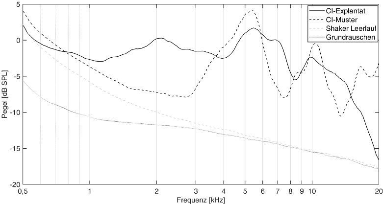 Das CI-Explantat des Patienten sowie ein CI-Demonstrationsmuster des gleichen Implantattyps wurden im reflexionsarmen Raum der TU Darmstadt mit Hilfe eines Shakers reproduzierbar mit gleicher Anregung und Bewegungstrajektorie mechanisch angeregt. Das Klickgeräusch konnte mit dem beschriebenen Versuchsaufbau reproduzierbar erzeugt und mittels Schalldruckpegelmessungen charakterisiert werden. Im Amplitudenspektrum der Messungen zeigte sich die höchste Energie des Klickgeräuschs im Frequenzbereich oberhalb von 3 kHz mit einem Maximum bei 4,5 bis 7 kHz. In dem für die Wahrnehmung des Klickgeräuschs relevanten Frequenzbereich oberhalb von 1,5 kHz betrug der äquivalente Dauerschallpegel (Leq) durch die mechanische Anregung der beiden Proben 29–31 dB bei einem Spitzenpegel von 66,4–67,2 dB.