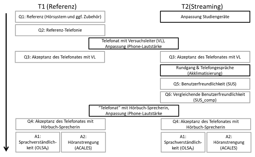In beiden Terminen wurden die Teilnehmenden vom Versuchsleiter (VL) angerufen und stellten den Schallpegel des Smartphones so ein, dass ein angenehmer Lautheitseindruck entstand. Dann bewerteten sie die Einstellung des Telefongesprächs mit dem Versuchsleiter unter Laborbedingungen im Hinblick auf die Akzeptanz (Q3, z.B. Sprachverständlichkeit, Höranstrengung, Klangqualität und Lautheit).