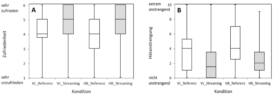 Abbildung 2: A: Bewertungen der Gesamtzufriedenheit für das Telefonat mit Versuchsleiter (VL) und die Hörbuch-Kondition (HB). B: Bewertung der subjektiven Höranstrengung für die beiden Telefon-Konditionen (VL, N=20; HB, N=19). In weiß sind die Ergebnisse für die Referenzkondition und in hellgrau die Ergebnisse für die Streaming-Kondition dargestellt. Abgebildet sind Box Plots (Median und Quartile) mit Whiskern vom Minimum bis zum Maximum der Daten.