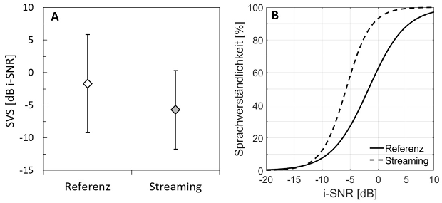 Abbildung 3: A: Mittlere Sprachverständlichkeitsschwellen (SVS) im Störgeräusch in dB i-SNR und interindividuelle Standardabweichungen für Referenz- und Streaming-Bedingungen aus Messungen mit gleichzeitiger Abschätzung der Steigung. B: Mittlere Sprachverständlichkeitsfunktionen für die Referenz- (durchgezogene Linie) und Streaming-Bedingung (gepunktete Linie). Aufgrund der Lesbarkeit werden nicht alle individuellen Funktionen für beide Konditionen (insgesamt 34 Funktionen) dargestellt.