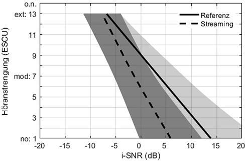 Abbildung 4: Mittlere Höranstrengungsbewertungen (effort scale categorical units, ESCUs) von 10 Teilnehmenden und die Referenz-Linie (durchgezogen), sowie Streaming-Bedingung (gestrichelte Linie) als Funktion des Signal-Rauschabstandes (i-SNR) von Sätzen und Störgeräusch; die Bereiche um die mittleren Funktionen herum zeigen die Streuung (Standardabweichung). Die ESCU reichen von 1=„überhaupt nicht“ anstrengend bis 13=„extrem anstrengend“, zusätzlich gibt es die Antwortkategorie ‘nur Störgeräusch’ (o.n.).