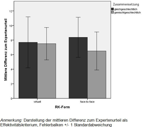 The investigation of the effect of the influencing factors group size (F(2)=0.18, p=0.84, η2=0.03) and sex composition (F(1)=2.06, p=0.17, η2=0.13) which were constant over all test conditions does not show any significant results either. In the test condition face-to-face the mean difference to the expert’s opinion of same-sex groups is M=8.38 (SD=2.05) and of mixed-sex groups is M=6.50 (SD=1.04). In the virtual RC errors of the expert’s opinion are detected in same-sex groups with M=7.69 (SD=3.10) and in mixed-sex groups with M=7.59 (SD=2.40) (see figure 2 [Fig. 2]).