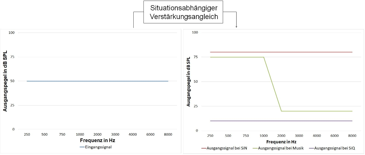 Diese Abbildung zeigt lediglich das Prinzip des Verfahrens und nicht die tatsächlich erwarteten Werte für die drei Einstellungen der Situationen Sprache in Ruhe (SiQ), Sprache im Störgeräusch (SiN) und Musik.