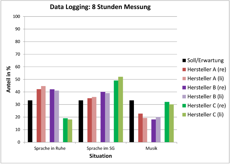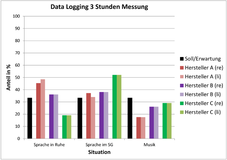 Um zu ermitteln, wie zuverlässig Standardsituationen aufgezeichnet werden und ob die Genauigkeit durch eine längere Aufzeichnungsdauer begünstigt wird, wurde zunächst eine 8- und anschließend 3-Stunden-Messung für jeden der drei Hersteller durchgeführt. In allen Messdurchläufen wurden die drei Standardsituationen zu gleichen Anteilen dargeboten. Im ersten Drittel der 8- bzw. 3-Stunden-Messung wurde „Sprache in Ruhe“, im nächsten Drittel „Sprache im Störgeräusch“ und im letzten Drittel „Musik“ vorgespielt. Es ist hervorzuheben, dass in während dieser Messung, jede Situation einzeln dargeboten wurde und nie eine Kombination der Situationen zustande kam. In einer weiteren Messung wurde daraufhin getestet, wie eine „komplexe Situation“ im Data Logging dokumentiert wird. Diese „komplexe Situation“ stellte eine Kombination der Standardsituationen dar und reproduzierte eine Umgebung, wie sie z.B. in einer Bar vorzufinden sein könnte. Für dieses Szenario wurde eine Messdauer von zwei Stunden gewählt. Die Dauer der Messungen basierte auf den Funktionsweisen des Data Logging der Hersteller, welche im Teil „Data Logging“ beschrieben ist.