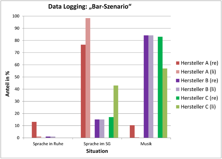 Das Bar-Szenario (Abbildung 4 [Abb. 4]) bestand aus den drei Hauptsituationen „Sprache“, „Störgeräusch“ und „Musik“. Auf einen Soll-Wert wurde an dieser Stelle verzichtet, da das Bar-Szenario unterschiedlich interpretiert werden kann und es keine feste Zuordnung, wie es bei den einzelnen Situationen der Fall ist, gibt. Dennoch ist für jeden Hersteller ein deutlicher Unterschied in der Dokumentation erkennbar, wodurch sich keine direkte Aussage treffen lässt, wer die komplexe Situation am realitätsgetreusten aufgezeichnet hat. Zusätzlich fällt für Hersteller A und C deutlich auf, dass es auch zwischen der jeweils rechten und linken Seite zu großen Differenzen kam. Während bei Hersteller A Abweichungen von bis zu 20% (Sprache im SG) entstehen, kommt es bei Hersteller C zu ca. 25%.