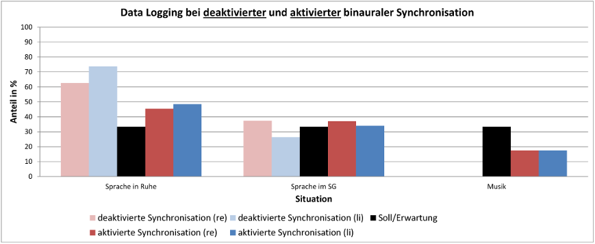 Vergleicht man die Aufzeichnungen bei deaktivierter mit denen für aktivierte binaurale Synchronisation, so sind deutliche Unterschiede erkennbar. Im Vergleich zu den Ergebnissen bei deaktivierter Synchronisation nähern sich die aufgezeichneten Anteile dem Soll-Zustand an. Während zuvor keine Musik erkannt wurde, liegt der Anteil erkannter Musik durch die Aktivierung der Synchronisation bei ca. 18%. Dennoch liegen weiterhin Abweichungen für „Sprache in Ruhe“ und „Musik“ bei bis zu 15% vor. „Sprache im SG“ wurde deutlich genauer erkannt und wies maximale Abweichungen von ca. 5% auf.
