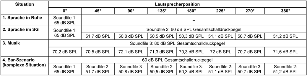 Durch die Verteilung der Soundfiles auf die Lautsprecher, konnten verschiedene Situationen konstruiert werden. Die erste Situation simulierte Sprache in Ruhe. Soundfile 1 wurde dem Lautsprecher in 0° zugeordnet und ein Pegel von 65 dB eingestellt [21]. Für die zweite Situation, „Sprache im Störgeräusch“, wurde Sprache aus 0° und das Störgeräusch aus 45–315° dargeboten. Der Pegel der Sprache betrug hierbei ebenfalls 65 dB SPL und der Gesamtpegel des Störgeräusches 60 dB SPL. Um einen Pegel von 60 dB SPL Störgeräusch zu gewährleisten, wurden zunächst nur die Lautsprecher von 45 bis 315° aktiviert und so eingestellt, dass der Gesamtpegel des Störgeräusches bei 60 dB SPL lag. Es wurde darauf geachtet, dass Soundfile 2 pro Lautsprecher zu unterschiedlichen Zeitpunkten startete und die Pegel der einzelnen Lautsprecher über alle Lautsprecher gleich waren.
