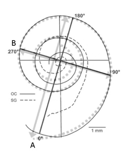 Ist als Bezugspunkt der Ort der Spiralganglienzellen (SG) vorgesehen, sind A2=–99,3, B2=0,004, C2=105 einzusetzen (Funktion ysg(x)). Stakhovskaya et al. [3] stellten signifikante Unterschiede für die mittels Gleichung 2 an den Orten OC und SG bestimmten Ep-Fz fest. Die Strecke, welche sich aus der Verteilung der SG entlang der Mitte des Rosenthal-Kanals ergab, zeigte sich signifikant kürzer als die Strecke der Verteilung des OC innerhalb der Cochlea. Der Rosenthal-Kanal ist eine knöcherne Ausziehung des Modiolus (zentrale knöcherne Achse der Cochlea), welcher die Spiralganglienzellen umschließt. Es zeigte sich eine signifikante Korrelation zwischen der absoluten Länge von OC und SG, welche die Annahme zulässt, dass bei bekannter Länge des OC die Berechnung der Länge der SG möglich ist. Durch die unterschiedliche Länge der Verteilung von OC und SG ist der maximale Positionswinkel der SG deutlich kleiner (Abbildung 1 [Abb. 1]).