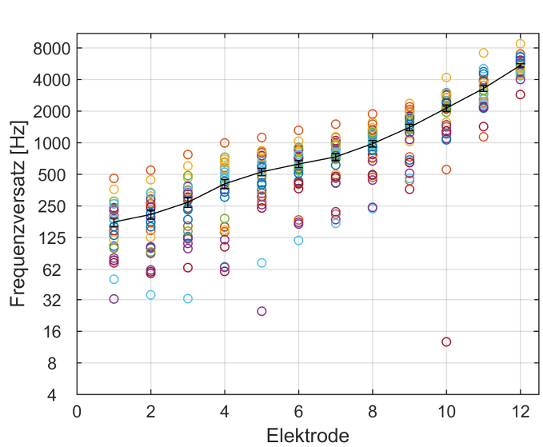 Wie bereits erläutert hängt der von den Reizelektroden überspannte Stimulationsbereich stark von der Elektrodenlänge, Elektrodenbauform und den individuellen anatomischen Verhältnissen der Cochlea ab. Die Verteilung der den einzelnen Elektroden zugeordneten Bandpassfilterfrequenzen zeigt im Vergleich zur regulären Ep-Fz-Verteilung einen Frequenzversatz (FV), der zusätzlich von der erreichten Insertionstiefe abhängt.