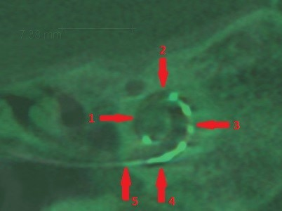 Abbildung 2: Darstellungen aller relevanten Begrenzungen und Strukturen einer rechten Cochlea (laterale (1), craniale (2), mediale (3), caudale (4) Begrenzung und rundes Fenster (5)), eingefärbt zur Hervorhebung der entsprechenden Bereiche; Überlagerung postoperativ entstandener DVT-Bilder mit einliegendem Elektrodenträger; helle, hervorgehobene Bereiche kennzeichnen Elektrodenkontakte.