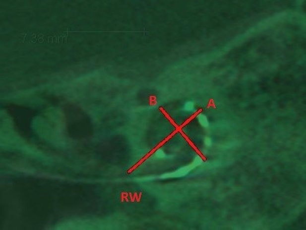 Um die individuelle Länge des ductus cochlearis (cochlear duct length, CDL) berechnen zu können, wurden jeweils vier für die Identifikation der Begrenzungen des cochleären Lumens relevante Schichten identifiziert. Hierfür wurden coronar projizierte Schichtschnitte verwendet, in denen die caudale, mediale und craniale Begrenzung der Cochlea abgebildet waren. Zusätzlich wurde ein Schnittbild mit Abbildung des runden Fensters ermittelt. Die nach Escudé et al. [4] zu bestimmende Strecke A verläuft hierbei vom runden Fenster (RF) zur gegenüberliegenden medialen Begrenzung der Cochlea.