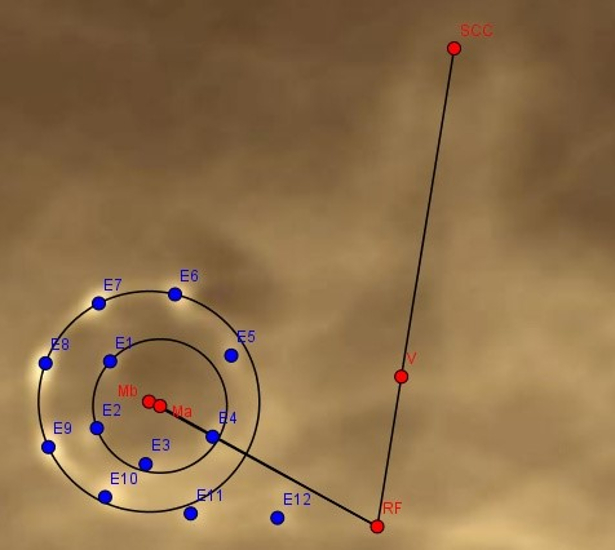 (Abbildung 4 [Abb. 4]). Die Hilfskreise dienen zur Darstellung des Verlaufs der ersten zwei Windungen der Cochlea und zur Vereinfachung der Zuordnung der Elektroden zur jeweiligen Windung. Hierfür wurde angenommen, dass sich alle Elektroden, die vor der Strecke Ma und RF (rundes Fenster) liegen, in der basalen Windung liegen und alle folgenden Elektroden in der apikal folgenden Windung. In Abbildung 4 [Abb. 4] umfasst der basale Kreis die Elektroden E12 bis E4, auf dem apikalen Kreis sind die übrigen Elektroden E3 bis E1 erfasst. Anschließend wurde eine Referenzlinie erzeugt, die von der Spitze des Canalis semicircularis superior (engl. superior semicircular canal – SCC) über das Vestibulum (V) bis zum Runden Fenster (RF) reicht. Die Verbindung von Ma bzw. Mb zu RF bilden die Grundlinie (0 Grad) von der ausgehend die Windungen der Cochlea eingeteilt werden und die Lage der einzelnen Elektroden bestimmt werden kann. Zur Bestimmung der Insertionswinkel wurde das Programm PicPick (https://picpick.app/de) genutzt. Der Elektrodenabstand beträgt bei dem in dieser Studie untersuchten FLEX28 Elektrodenträger 2,1 mm. Je nach Position auf dem Elektrodenträger sind die Elektroden einzeln oder paarweise ausgeführt. Um eine möglichst große Kontaktoberfläche abzudecken variieren bei den FLEX Elektrodenmodellen die Durchmesser der Kontakte. Apikal gelegene Elektroden E1 bis E5 weisen einen Kontaktdurchmesser von 0,46 mm auf, während Elektroden E6 bis E12 einen Durchmesser von 0,3 mm besitzen.