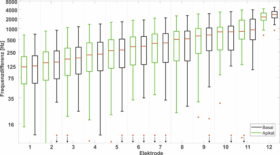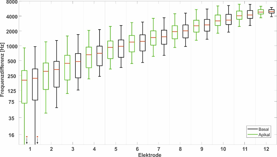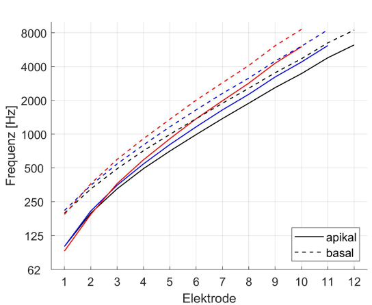 Bei ertaubten Patienten liegt häufig eine Schädigung des Innenohres, also der Hörsinneszellen vor. Die nicht mehr verfügbaren Haarsinneszellen werden durch die elektrische Stimulation des Hörnervs über in die Hörschnecke inserierte Elektroden umgangen. Eine wichtige physiologische Voraussetzung für die Übertragung akustischer Information mittels Cochlea-Implantat (CI) ist die sogenannte Tonotopie der Cochlea bzw. der Basilarmembran. Die Basilarmembran wird in ihrem Verlauf von der Basis zum Apex breiter und ihre Steifigkeit nimmt ab. Dies führt zur frequenzspezifischen Auftrennung von akustischen Signalen entlang der Basilarmembran. 1961 formulierte Greenwood [1] den Zusammenhang zwischen Frequenz und Ort der maximalen Auslenkung der Basilarmembran (Greenwood-Funktion).