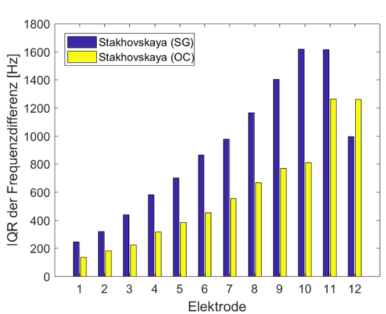 Für die nach den verschiedenen Modellen bestimmten Ep-Fz-Unterschiede wurde für jede Elektrodenposition der Interquartilsabstand (IQR) berechnet. Der IQR ist ein Streuungsmaß und gibt die Differenz zwischen dem oberen (75%) und dem unteren (25%) Quartil an. Dieses Streuungsmaß erlaubt Rückschlüsse über die Streuung der mit den verschiedenen Modellen erzielten Ergebnisse.