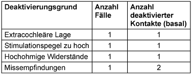 Weiterhin kann eine unvollständige Insertion der Elektrode zur Notwendigkeit der Deaktivierung von basalen Reizelektroden führen, um störende Nebeneffekte (z.B. Schmerzempfindung oder Fazialisnervstimulation) zu vermeiden. In der Regel wird bei Abschaltung von Elektroden das jeweils zugeordnete Frequenzband auf die verbleibenden Elektrodenkanäle verteilt. Im Probandenkollektiv war in 4 Fällen das Deaktivieren von bis zu 2 basalen Elektroden aus den in Tabelle 1 [Tab. 1] aufgeführten Gründen erforderlich.