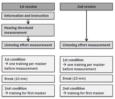 The study was approved by the ethics committee in accordance with the ethics application Drs. 47/2017. The measurement procedure is shown schematically in Figure 2 [Fig. 2]. The air-conduction hearing threshold was measured after receiving information and written consent of the participants. Subsequently, the subjective listening effort was measured. The measurements of the hearing-impaired participants were performed without hearing aids. In one session, the listening effort in both conditions (acoustic and audiovisual) was determined for all maskers. In addition to the order of the conditions, the order of the maskers within a condition was randomized. In the first measurement condition, each of the maskers was trained before the actual measurement in order to become familiar with the stimuli, maskers and the measurement procedure. In the second condition, the maskers, measurement procedures and OLSA sentences were already known and only one training session was performed at the start to familiarize participants with the new condition (audiovisual/acoustic). The training was similar to the first measurement phase of ACALES. The stimuli were presented in random order both during training and during the measurement. For ten of the 15 normal-hearing participants, the listening effort in both conditions was again evaluated in a second session and using all maskers. Only one training session per condition was performed during this session, as the measurement procedures, stimuli and masker were assumed to be known. On the first day, four training sessions and six measurements were performed per subject. On the second day, the number of training sessions was reduced to two.