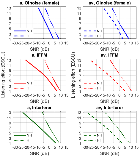 Figure 4: Comparison of the listening-effort curves of normal-hearing (n=14; dashed) and hearing-impaired participants (n=9; dotted) for all maskers in acoustic (a) and audiovisual (av) conditions
