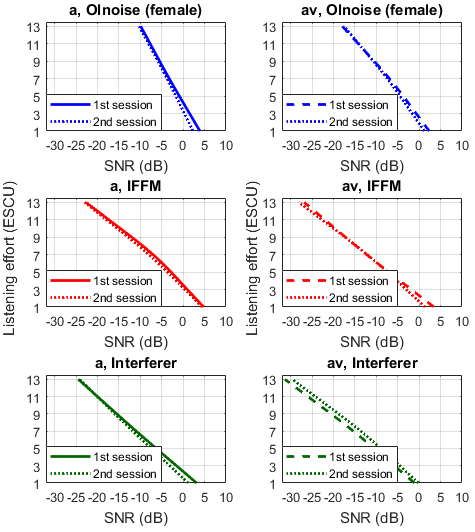 Figure 5: Comparison of the averaged listening-effort curves (n=10 normal-hearing participants) for all maskers in the acoustic (a) and in the audiovisual (av) conditions for the 1st and 2nd session