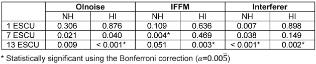 A repeated-measures ANOVA confirmed a significantly different rating of the maskers [F(2, 26)=15.774, p<0.001], as well as a significant difference in the categories [F(6, 78)=334.995, p<0.001]. The interaction between masker and categories was also significant [F(12, 156)=25.674, p<0.001]. The t-tests for paired samples showed significant differences between Olnoise and IFFM at 7 ESCU (p=0.004) and 13 ESCU (p<0.001), and between Olnoise and interferer, also in the categories 7 ESCU and 13 ESCU (p<0.001 each), considering the Bonferroni correction. For IFFM and interfering speaker, however, no significant differences were found (p>0.05).