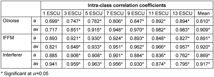 In addition, the intra-class correlation coefficient (ICC) was examined for each condition and each masker of the named categories (see Table 3 [Tab. 3]). At 0.856, the averaged ICC of the acoustic condition was slightly lower than that of the audiovisual condition (0.915). The lowest values were found in both the acoustic (0.699) and the audiovisual condition (0.717) for the Olnoise, both at 1 ESCU. The highest ICC was achieved for the audiovisual condition in Olnoise at 13 ESCU (0.983).