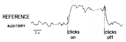 Die erste und bis heute einzige Beschreibung einer Registrierung von ASSR mit einem Lock-in Verstärker geht auf Schacham et al. [16] zurück. Sie ersetzten den Analog-Digital-Wandler und den Mittelwertrechner eines konventionellen EP-Systems durch einen Lock-in Verstärker (Princeton Research Model 5101) und wollten damit demonstrieren, dass der damals überall für EP-Messungen benutzte teure und große Prozessrechner PDP11 (DEC) durch ein preiswertes analoges Laborgerät ersetzt werden kann. Schacham et al. [16] registrierten stationäre Potenziale bei Stimulation mit 40-Hz-Klicks. Abbildung 2 [Abb. 2] zeigt, wie die Gleichspannung am Verstärkerausgang dem Ein- und Ausschalten des akustischen Reizes quasi in Echtzeit folgt.