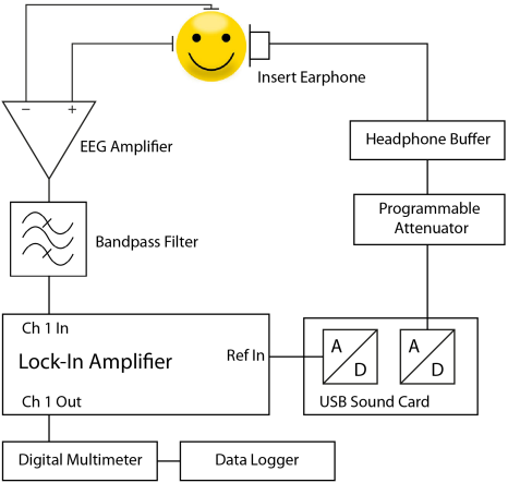 Abbildung 3: Blockschaltbild des in dieser Studie verwendeten Versuchsaufbaus zur Registrierung von ASSR mit einem Lock-in Verstärker