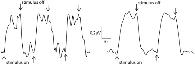 Abbildung 4: Ausgangssignal des Lock-in Verstärkers bei Ein- und Ausschalten eines 40-Hz-Chirpreizes für zwei verschiedene Zeitkonstanten des Integrators (linke Kurve 1 s, rechte Kurve 3 s); die Pfeile markieren den Zeitpunkt des Ein- und Ausschaltens des akustischen Reizes.