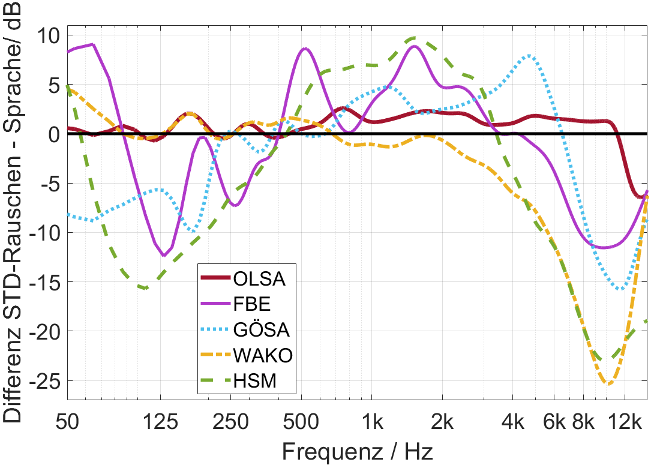 Jeder Sprachtest wurde mit den standardmäßig verwendeten Störgeräuschen (STD-Rauschen) durchgeführt. Die spektralen Abweichungen, die die STD-Rauschen zu den jeweiligen Sprachmaterialien aufweisen, sind in Abbildung 1 [Abb. 1] dargestellt. Dazu wurden alle Signale auf den gleichen digitalen Root Mean Square (RMS) kalibriert. Zur Bestimmung der Leistungsdichtespektren der Sprachmaterialien wurden für jeden Sprachtest alle Sätze oder Wörter ohne Pause hintereinander zu einem Signal zusammengefasst und analysiert.