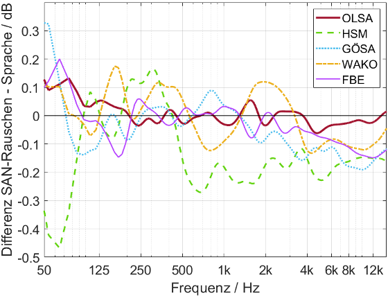 Für jeden Sprachtest wurde ein sprachsimulierendes Rauschen erzeugt (engl. Speech-Adjusted Noise, SAN-Rauschen), das den spektralen Eigenschaften des jeweiligen Sprachmaterials entspricht und somit eine optimale Verdeckungswirkung aufweist [23]. Zur Generierung der SAN-Rauschen wurde das Sprachmaterial jedes Sprachtests in Analogie zu [24] 30fach überlagert. Die Rauschsignale stehen im Repositorium Zenodo zur Verfügung [25]. In Abbildung 2 [Abb. 2] sind die Differenzen der Leistungsdichtespektren der SAN-Rauschen zur jeweiligen Sprache dargestellt. Wie bei den STD-Rauschen wurden alle Messsignale auf den gleichen RMS kalibriert. Die Unterschiede zwischen SAN-Rauschen und den Sprachmaterialen liegen weit unterhalb von 1 dB.