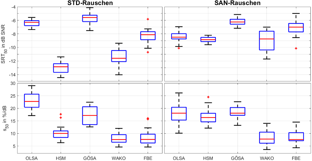 Beim Vergleich der SRT50-Werte zwischen STD- und SAN-Rauschen ergab der t-Test für OLSA, HSM, GÖSA und WAKO jeweils einen signifikanten Unterschied (Tabelle 5 [Tab. 5]). Der entsprechende Vergleich für den FBE zeigt keinen signifikanten Unterschied. Der t-Test zum Vergleich der s50 im STD- und SAN-Rauschen ergab nur für OLSA und HSM signifikante Unterschiede (siehe Tabelle 5 [Tab. 5]).