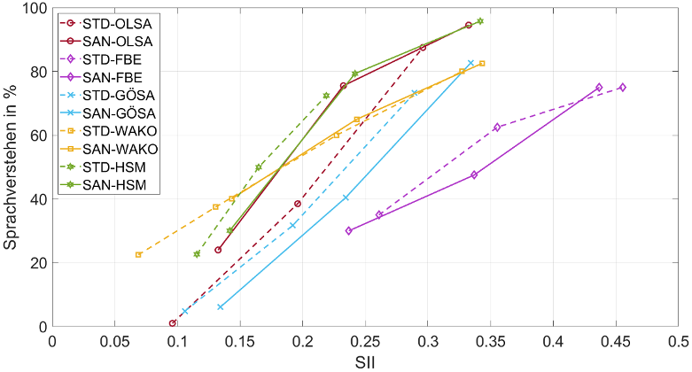 Für 50%iges Sprachverstehen ergibt sich für alle Sprachtests ein SII zwischen 0,17 (HSM-STD) und 0,34 (FBE-SAN). Die größte Differenz zwischen den SII-Werten eines Sprachtests im STD- und SAN-Rauschen liegt bei 0,04 (OLSA), während die kleinste Differenz 0,01 (WAKO) beträgt.