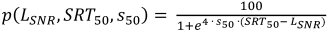 Die SNR wurden so gewählt, dass das Sprachverstehen möglichst unterhalb und oberhalb von 50% lag. Die Messergebnisse in Abbildung 3 [Abb. 3] (blaue Kreise) verdeutlichen, dass dieses Ziel für alle Sprachtests und beide Störgeräusche erreicht wurde. Für jede Messbedingung wurde an das erreichte prozentuale Sprachverstehen p in Abhängigkeit vom dargebotenen SNR (LSNR) eine Diskriminationsfunktion nach Brand und Kollmeier [26] (s. Gleichung 2) angepasst (rote Kurve) und daraus der SNR für ein Sprachverstehen von 50% (SRT50) sowie die Steigung in diesem Punkt (s50) bestimmt.