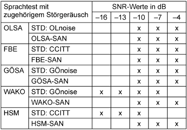 Tabelle 1: Verwendete Signal-Rausch-Abstände (SNR) aller Sprachtests im Standard-(STD)-Rauschen und im neu generierten sprachsimulierenden-(SAN)-Rauschen