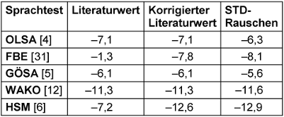 Tabelle 3: Gegenüberstellung der gemessenen SRT50-Werte in dB SNR im STD-Rauschen mit Werten aus der Literatur; für die korrigierten Literaturwerte wurden Unterschiede in der Kalibrierung berücksichtigt.