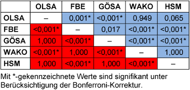 Auch im SAN-Rauschen tritt die größte vorkommende Differenz zwischen den Medianen des HSM und GÖSA auf, hierfür beträgt der SRT50 im HSM –8,9 dB SNR und im GÖSA –6,2 dB SNR. Die einfaktorielle ANOVA konnte ebenfalls signifikante Unterschiede nachweisen (F(1,95; 41,00)=34,13; p<0,001). Im PostHoc-t-Test wurde jedoch deutlich, dass sich die signifikanten Unterschiede auf die beiden Sprachtests FBE und GÖSA im Vergleich zu den drei anderen Sprachtests (OLSA, HSM, WAKO) beschränken (siehe Tabelle 4 [Tab. 4], blau). Die Unterschiede zwischen FBE und GÖSA sowie zwischen OLSA, HSM und WAKO sind nicht signifikant.