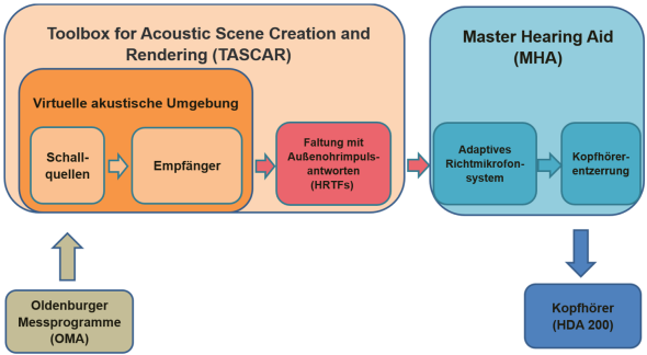 German guidelines for hearing-aid provision, noise direction, Freiburg monosyllabic speech test, Oldenburg sentence test, toolbox for acoustic scene creation and rendering, master hearing aid, directional microphone