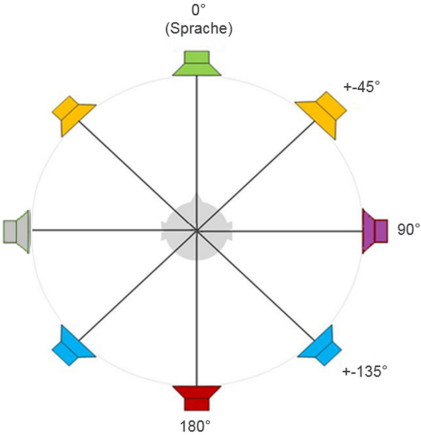 Abbildung 2: Sechs verschiedene Störgeräuschrichtungen. 0° (grün), ±45° (gelb), 90° (lila), ±135° (blau), 180° (rot) und diffus (alle acht Lautsprecher)