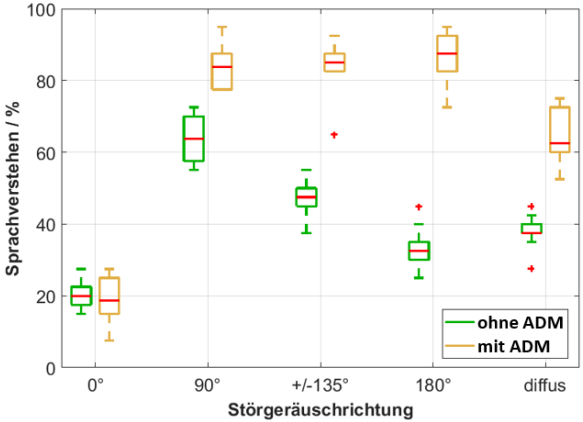 Die beiden Sprachtests FBE und OLSA zeigen keine signifikanten Unterschiede im Sprachverstehen zwischen den Konfigurationen ohne ADM und mit ADM für die Störgeräuschrichtung 0°. Der ADM nutzt die Annahme, dass sich das Nutzsignal immer frontal in der vorderen Hemisphäre und das Störsignal in der hinteren Hemisphäre befindet und passt seine Richtcharakteristik entsprechend an. Wenn das Nutzsignal und das Störsignal beide aus der frontalen Richtung kommen, erfolgte keine Abschwächung. Wenn jedoch nur der Nutzsprecher von vorn, das Störgeräusch jedoch aus einer anderen Richtung präsentiert wird, dann wird zwar nicht das Sprachsignal, aber das Störgeräusch je nach Richtcharakteristik durch den ADM abgeschwächt und der SNR verbessert sich.