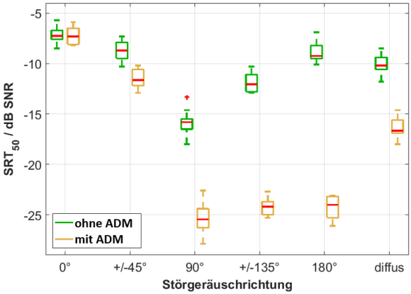 Für die Konfiguration ohne ADM liegt der Median für die Störgeräuschrichtung von 0° bei –7,3 dB SNR. Dieser Wert stimmt mit den für diese Richtung ermittelten Daten von Wagener et al. [5] überein. Auch Beutelmann und Brand [8] geben einen vergleichbaren SRT50 für eine simulierte akustische Umgebung an. Der SRT50 verbessert sich, wenn das Störgeräusch aus einer anderen Richtung als 0° präsentiert wird.