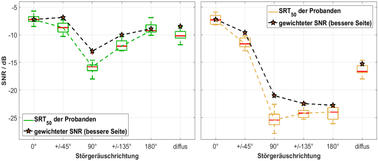 Da davon ausgegangen wird, dass nicht jeder Frequenzbereich gleich viel zum Sprachverstehen im Störgeräusch beiträgt, wurden die objektiven frequenzabhängigen SNR-Veränderungen nach ANSI S3.5 [10] für Sätze in 18 Terzbändern gewichtet aufsummiert. Andere Gewichtungsfunktionen führten zu ähnlichen Ergebnissen, werden jedoch nicht weiter betrachtet. Für die Ergebnisdarstellung wurde die Ohrseite mit dem besseren SNR ausgewählt, um den durch die Probanden nutzbaren Vorteil nachzubilden. Die objektiven Messungen der SNR-Veränderungen wurden nicht nur für die in der Probandenmessung verwendeten Störgeräuschrichtungen bestimmt, sondern zusätzlich für eine weitere unsymmetrische und eine symmetrische Störgeräuschrichtung. Für eine einzelne virtuelle Störgeräuschquelle wurden die Richtungen 0°, 45°, 90°, 135° 180°, 225°, 270° und 315° sowie für zwei virtuelle Störgeräuschquellen die Richtungen ±45°, ±90° und ±135° verwendet.