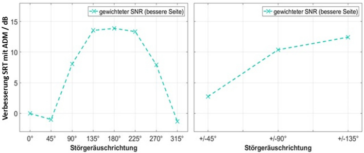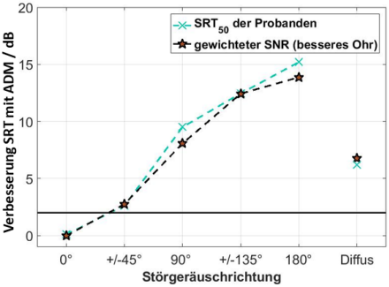 Die mit Probanden ermittelten Veränderungen im Sprachverstehen für verschiedene Störgeräuschrichtungen und mit ADM wurden mit objektiv berechneten SNR-Veränderungen mit der Methode nach Hagerman und Olofsson verglichen. Die objektiven Berechnungen des SNR für das bessere Ohr können die Effekte qualitativ nachbilden. Die Änderungen des SNR sind damit der Hauptgrund für die signifikanten Unterschiede zwischen den Konfigurationen ohne ADM und mit ADM für die verschiedenen Störgeräuschrichtungen.