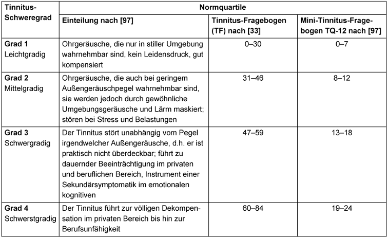 Tabelle 1: Bestimmung des Tinnitusschweregrades nach diversen Einteilungen; verglichen wird die Einteilung nach Biesinger mit dem 40-Item-selbsteinschätzenden Instrument Tinnitus-Fragebogen (TF) [33] und dem 12-Item-selbsteinschätzenden Instrument Mini-TQ 12 [97]