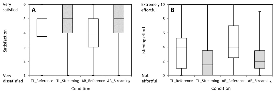 Figure 2: A: Ratings of overall satisfaction for the telephone call with the test leader (TL) and the audio book condition (AB). B: ratings of subjective listening effort for the two phone conditions (TL, N=20; AB, N=19). Results for the reference condition are shown in white and results for the streaming condition are shown in light gray. Boxplots (median and quartiles) with whiskers from the minimum to the maximum of the data are shown.