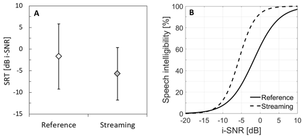 Figure 3: A: Mean speech reception thresholds (SRTs) in noise in dB i-SNR and interindividual standard deviations for reference and streaming conditions from measurements with simultaneous slope estimation. B: Mean speech intelligibility functions for the reference (solid line) and streaming (dotted line) conditions. Due to readability, not all individual functions for both conditions (34 functions in total) are shown.