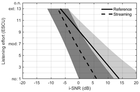 Figure 4: Mean listening effort ratings (effort scale categorical units, ESCUs) of 10 participants and the reference (solid line), and streaming condition (dashed line) as a function of signal-to-noise ratio (i-SNR) of sentences and noise; the areas around the mean functions show the spread (standard deviation). The ESCU range from 1=“effortless” to 13=“extremely effortful”; in addition, there is the response category ‘noise only’ (no).