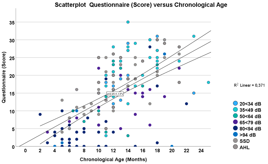 In Figure 1 [Fig. 1], the scatter plot represents the distribution of scores in the LEAQ as a function of age in months and severity of hearing loss. The variables “degree of hearing loss” and “total scores in the LEAQ” show a positive correlation (Figure 2 [Fig. 2]). In the pairwise comparison of medians, there is a significant difference of p≤0.001 between the score in the questionnaire score in the profound hearing loss (65 dB and deafness >95 dB) and WHO grades 1–3 groups. In addition, there is a significant difference between the groups’ asymmetric hearing loss (AHL) or unilateral deafness (SSD) and the group of profound hearing loss. Significance values are adjusted with the Bonferroni correction. For the groups that differ significantly, a correlation coefficient of r=0.1 is calculated. In summary, the pairwise comparison by the Kruskal-Wallis test shows that the degree of hearing loss influences the outcome in the LEAQ. Therefore, the procedure is a good instrument for follow-up diagnosis during clinical follow-up. As expected, the group of children with mild hearing loss differs in terms of hearing and language development from the group of children with severely, profound hearing loss or deafness. However, based on the scatter plot, there are indications that n=79 (44.4%) of the participants are below the minimum level. This demonstrates that language acquisition is at risk and hearing aid checks are particularly important for this group so that addressing developmental delays early is possible. Table 1 [Tab. 1] shows that the risk of language delay concerns all degrees of hearing losses, especially the children with profound hearing loss to deafness, but also the subjects with unilateral deafness (12/28 children) and moderate hearing loss.