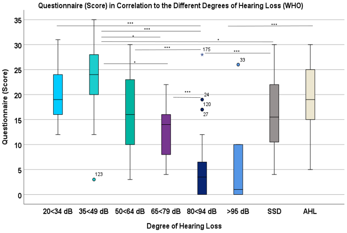 Figure 2: Results of LEAQ-Questionnaire differentiated into groups of degree of hearing loss. The variability of the groups with severe degree 50 <79 dB and the children with AHL, children with profound hearing loss and deafness are candidates for a Cochlear Implant.