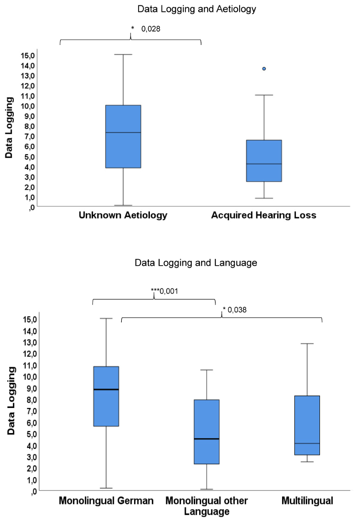 The correlation between “aetiology of hearing loss” and “data logging” is statistically significant. These groups differ significantly (p≤0.028).